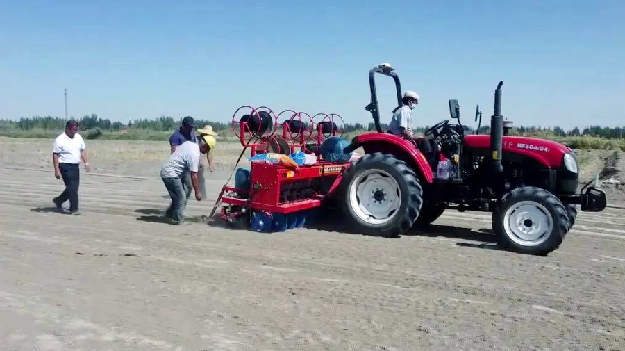 在岳普湖县巴依阿瓦提乡柳树王村的小麦种植现场,,装有北斗终端的大马力拖拉机正按照预先设定的播种线路精量播种小麦。。。整地、、、、施肥、、播种,,整个种植过程紧张有序,,,现场一派繁忙景象...