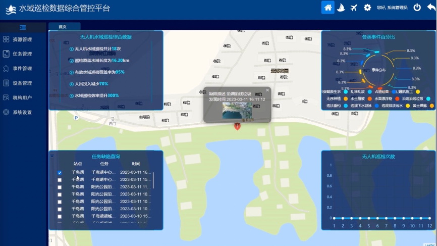 基于北斗高精服务的巡逻无人机自主完成起飞、、、、图像采集、、、降落、、充电等动作,,采集视频数据回传给水域巡检数据综合管控平台,,,,经过视觉AI分析,,,对千岛湖复杂多样的线索进行自动分类,,,,同步给“数字第一湖”平台...