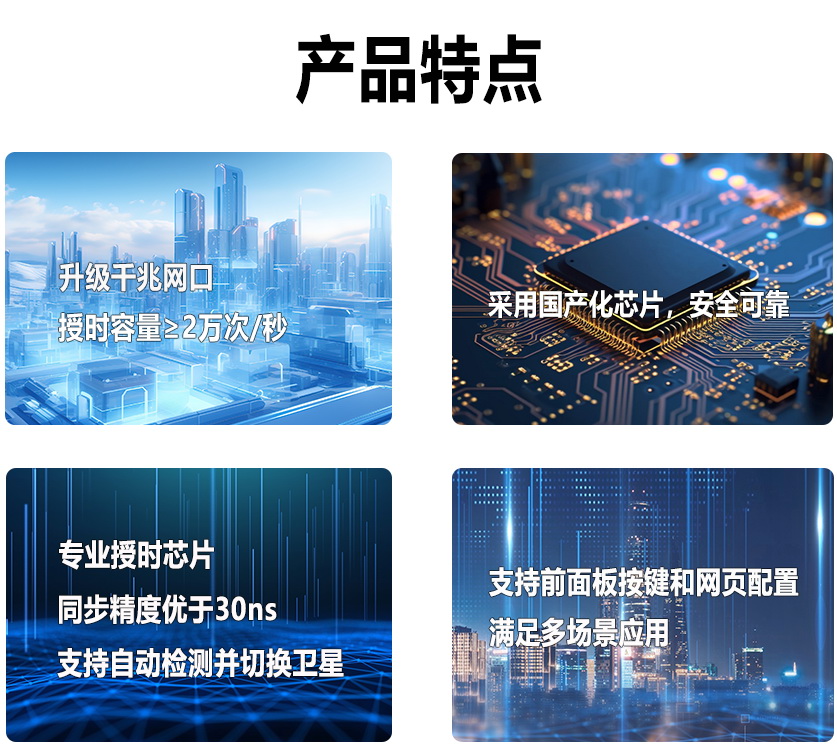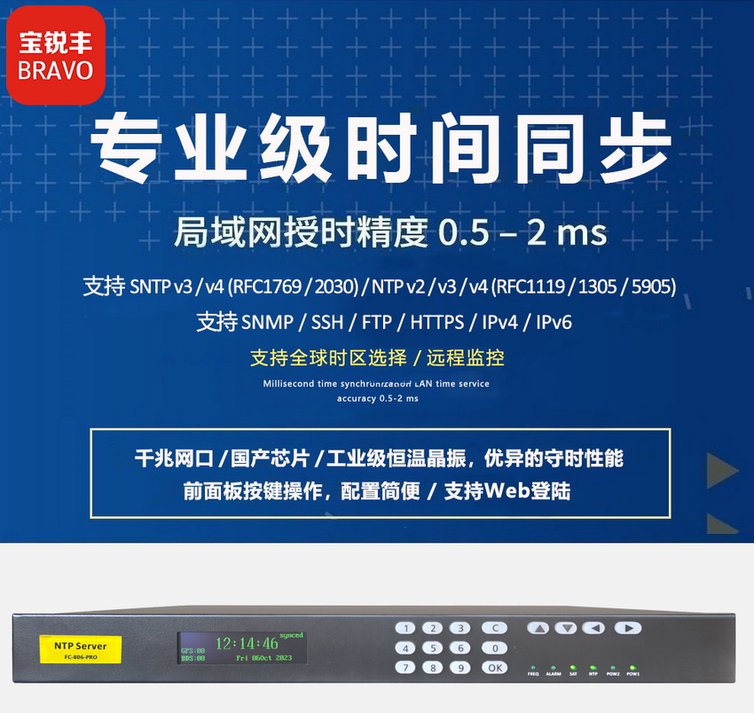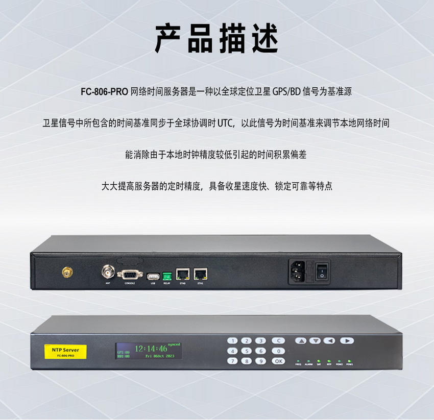 近日,,,我司推出一款千兆网口 NTP 网络时间服务器 FC-806-PRO ,,采用国产专业型授时芯片和处理器,,,安全可靠,,同步精度优于30ns。。。。全千兆网口,,均为物理隔离,,授时容量≥20000次/秒。。支持SNTP和NTP协议,,,支持IPv4/ IPv6、、支持SSH/FTP/HTTPS/SNMP协议,,,满足多场景应用。。前面板按键配置设备IP地址,,操作简便。。。
