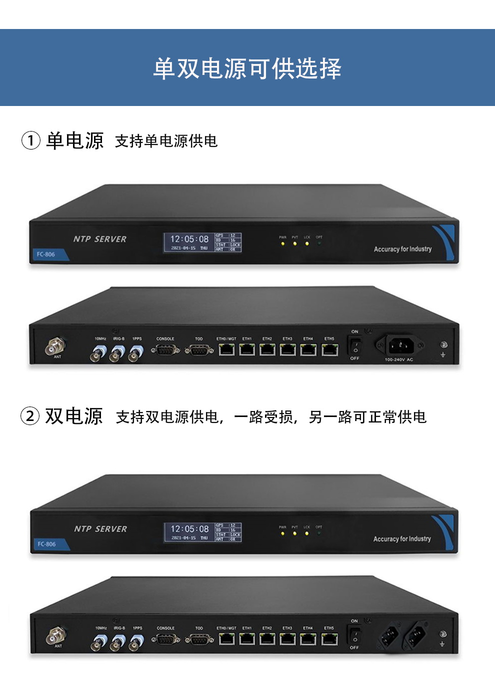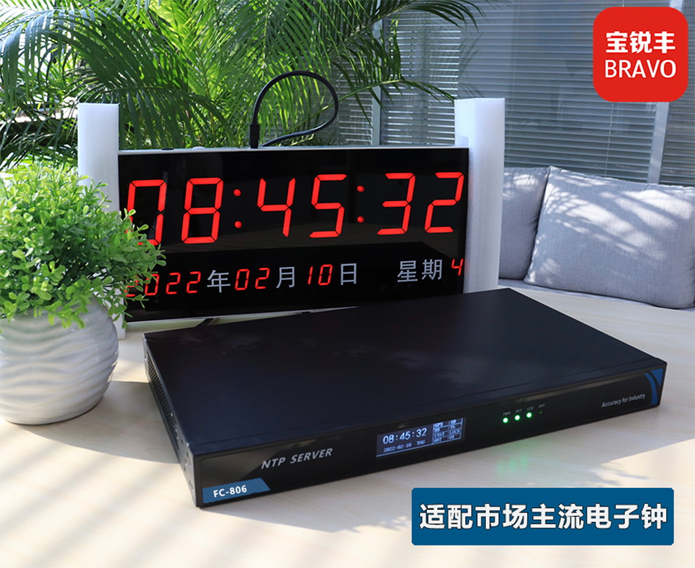 FC-806 是一款基于 NTP v2 / v3 / v4 / SNTP 协议的专业级网络时间服务器,,,,前面板带 OLED 高清液晶显示屏,,内置工业级恒温晶振,,,,具备守时功能,,,,可部署于有更高要求的严苛应用环境;支持远程监控和全球时区选择功能,,满足国际用户多样化应用场景;支持 B 码输出功能,,授时精度可达到 35ns;设备持续向网络中的联网设备提供毫秒级时间同步服务,,主要应用于部队、、、、机场、、、高速公路、、、、自动驾驶、、银行、、电力、、工厂自动化控制等领域。。